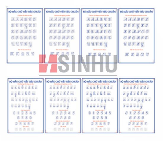 a) Bộ mẫu chữ viết quy định trong trường tiểu học được phóng to, in 2 màu. Gồm 8 tờ, kích thước (540x790)mm, dung sai 10mm, in trên giấy couché, định lượng 200g/m2, cán láng OPP mờ, trong đó:
