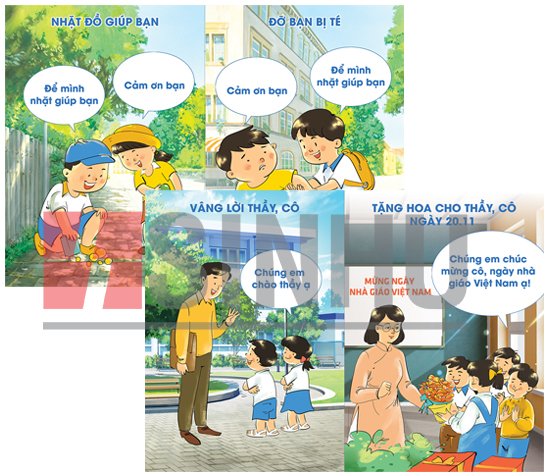 Bộ tranh thực hành, kích thước (148x210) mm, in offset 4 màu trên giấy couché định lượng 200g/m2, cán láng OPP mờ; gồm 2 tờ, minh họa: